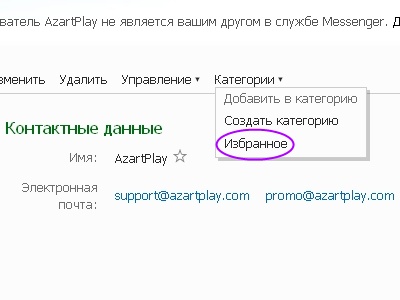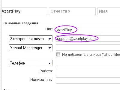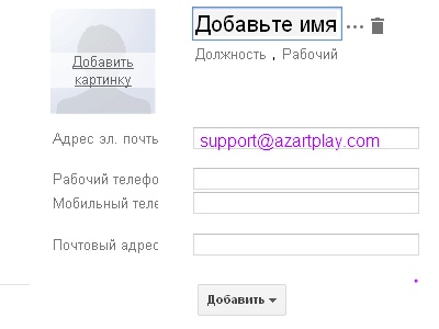 Введите ник контакта, например, Azartplay, и адрес электронной почты: support@azartplay.com. Повторите те же действия для адреса promo@azartplay.com.