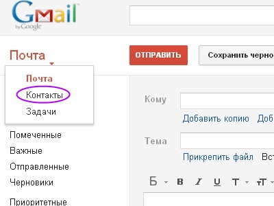 Зайдите в свой почтовый ящик на сервисе http://gmail.com. Перейдите в раздел "Контакты".